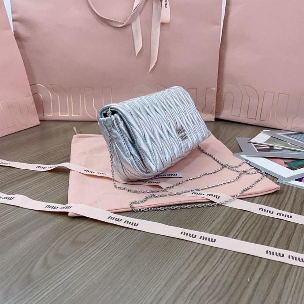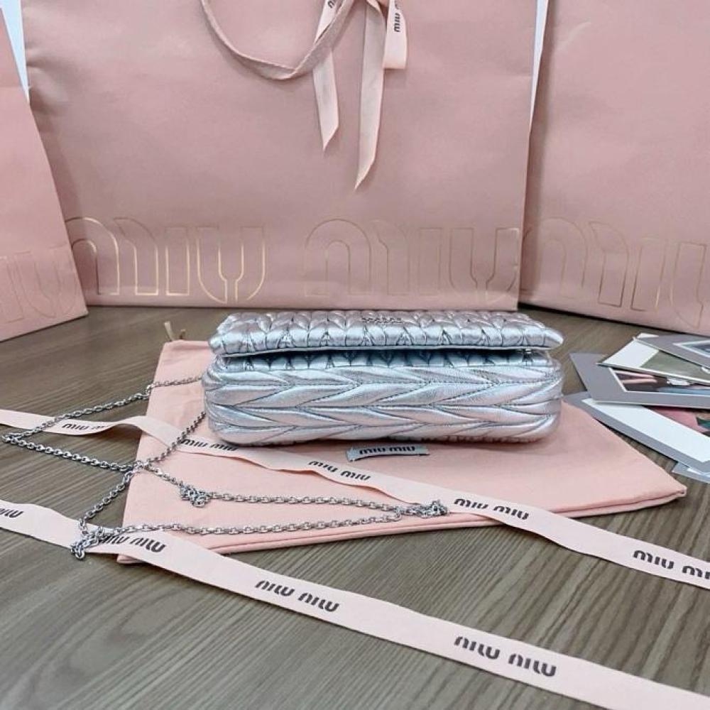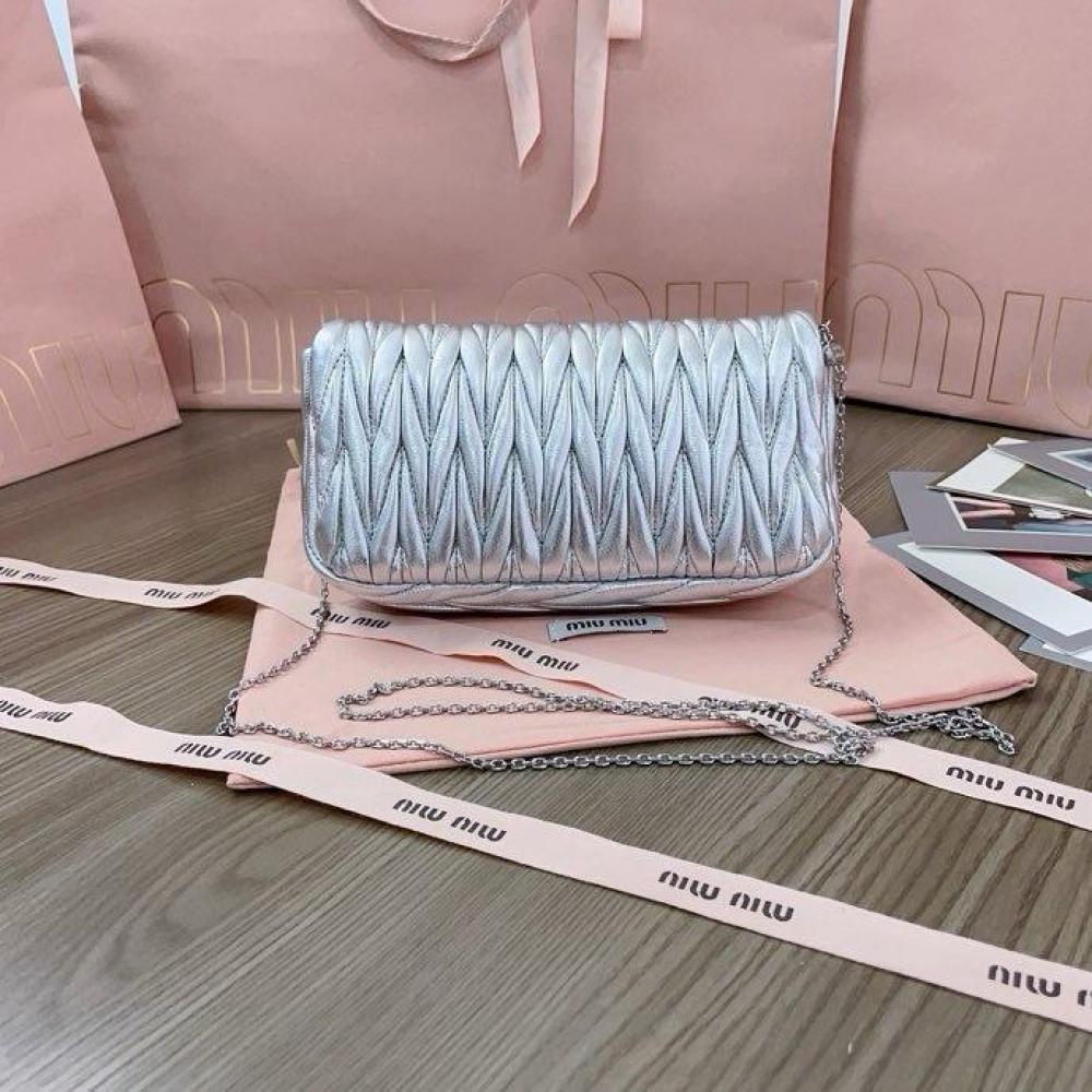 حقيبة من Miu Miu بالجلد الفضي الفاخر و الأنيق ، الخيار الأفضل لمناسباتك.